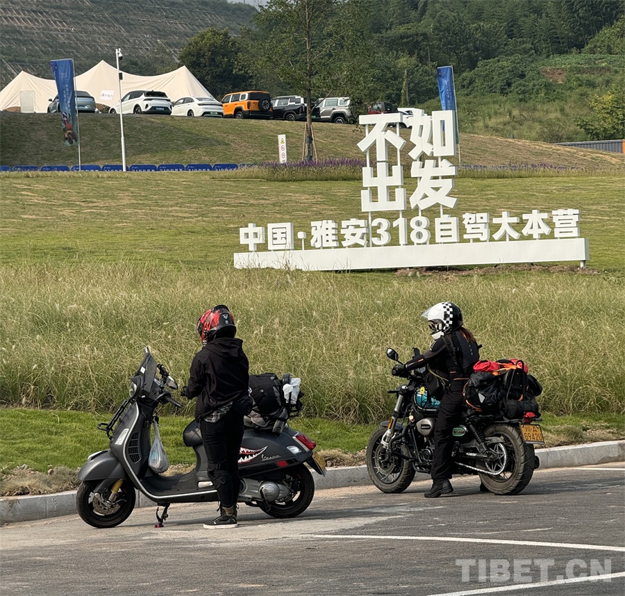 雅安318自駕大本營門口,在一塊“不如出發(fā)”的大型標(biāo)識牌面前,來自重慶和四川成都的兩位騎行女孩正整裝待發(fā)?!皣鴳c長假馬上來了,我們就想做一件平時(shí)難做的事情,騎行318直達(dá)拉薩!拉薩是另一個(gè)夢開始的地方,我們想到拉薩見一見朋友,再嘗一下非常好喝的酸奶?!闭硗曛螅瑑晌或T行女孩喊出了“我們拉薩見”的告別口號,戴上頭盔,伴著機(jī)車的轟鳴聲,騎行走上了318的遠(yuǎn)方。(中國西藏網(wǎng) 記者/王妍丹 蘇洋)