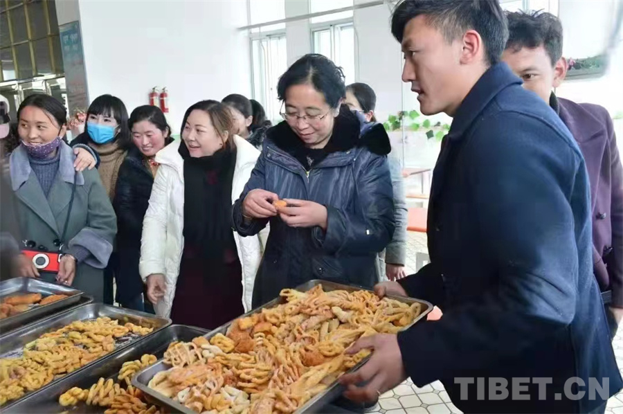 圖為次仁拉姆查看學校食堂內伙食供應情況
