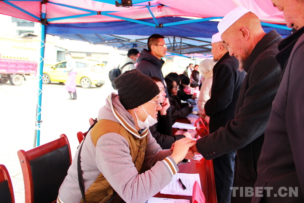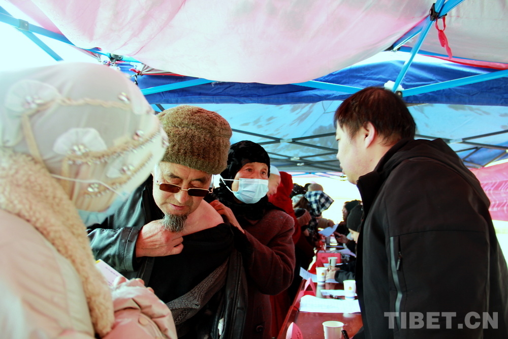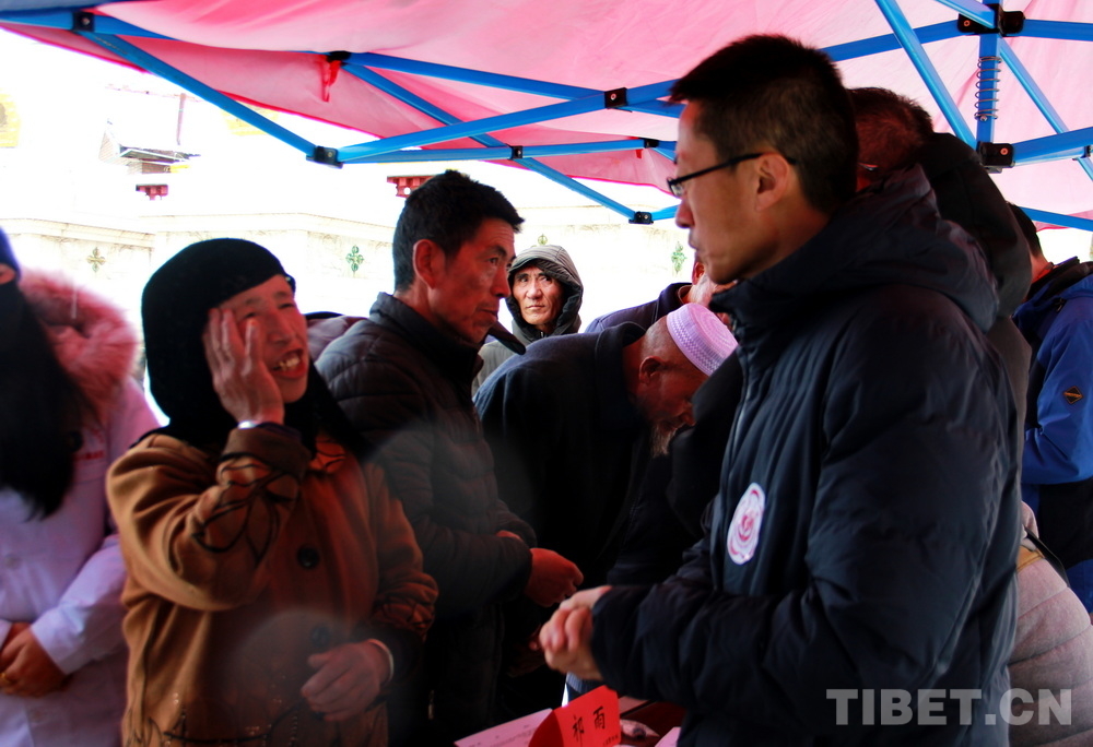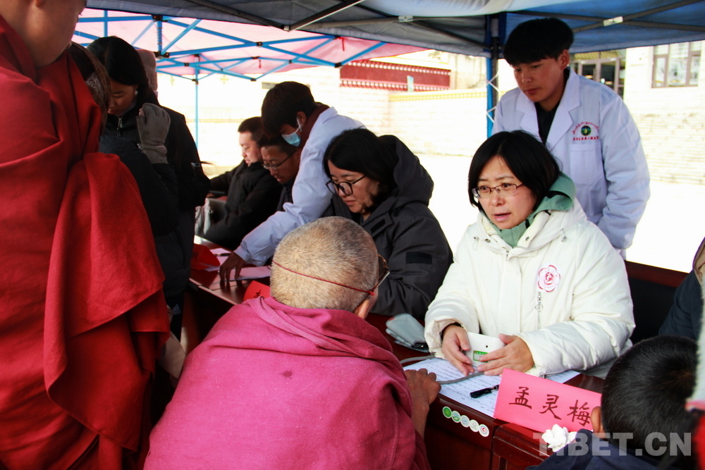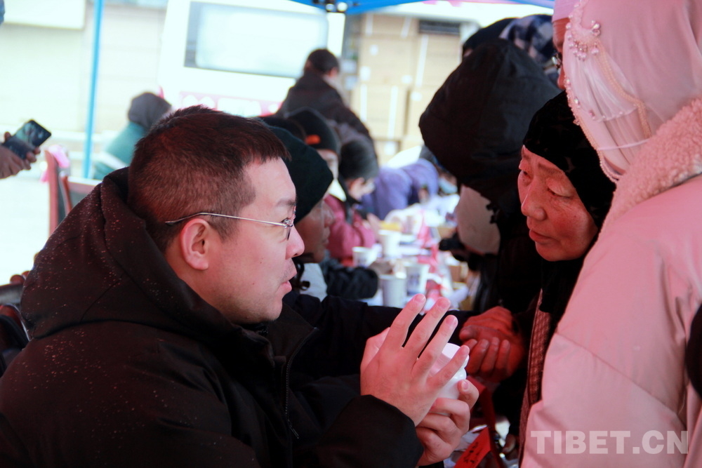在郎木寺義診點(diǎn),此前為了容納更多群眾就診,因此將義診點(diǎn)設(shè)在了寺院門外的小廣場。盡管大雪紛飛,但提前得知義診消息的群眾已經(jīng)陸續(xù)趕來,擔(dān)心臨時更換義診場所影響后續(xù)前來的群眾就診,醫(yī)務(wù)志愿者們毫無怨言地在臨時搭起的防雨棚下按時開始了義診。