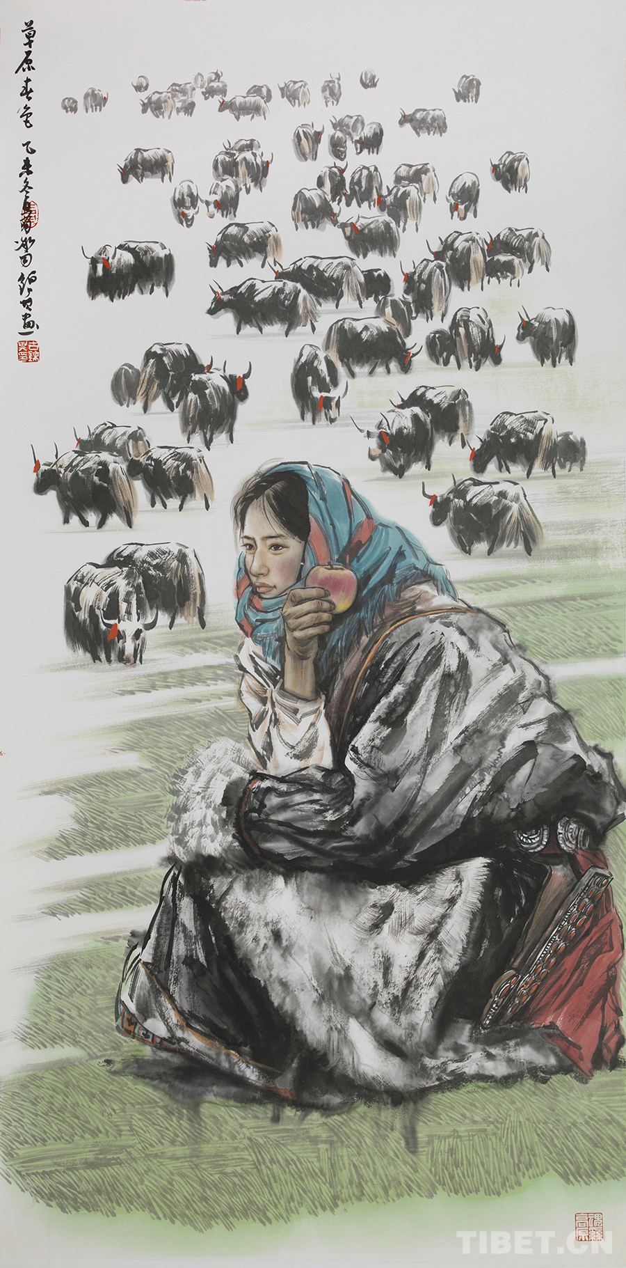 在南粵大地出生成長、工作生活的古錦其,曾50多次前往雪域高原采風寫生,與雪域高原結下了不解之緣。他的中國畫作品不僅描繪了高原的自然風光,更通過細膩的人物描繪,傳達了高原人民的真實生活狀態(tài)和精神風貌,洋溢著濃郁的高原生活氣息。