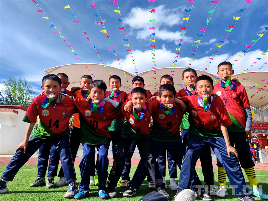 圖為洛隆縣俄西鄉(xiāng)第一小學(xué)的學(xué)生們在足球場上開心合影