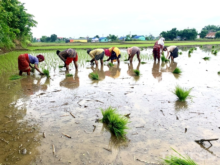 圖為尼泊爾農(nóng)民正在水田中耕種