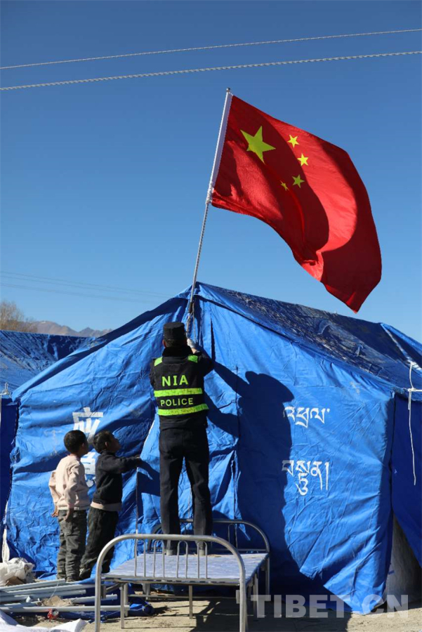 圖為西藏移民管理警察在定日縣長所鄉(xiāng)雜村受災(zāi)安置點(diǎn)懸掛五星紅旗 攝影:郭遠(yuǎn)敬