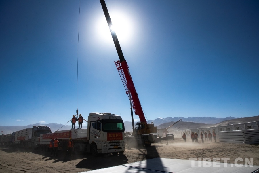 圖為工作人員正在日喀則市定日縣長(zhǎng)所鄉(xiāng)森嘎村內(nèi)抓緊搭建活動(dòng)板房 攝影:趙振宇