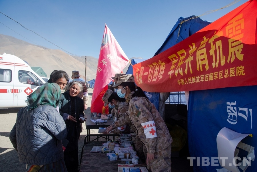 圖為中國人民解放軍西藏軍區(qū)總醫(yī)院醫(yī)務(wù)人員正在森嘎村向受災(zāi)群眾提供醫(yī)療服務(wù) 攝影:趙振宇
