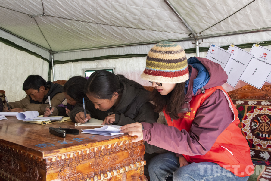 圖為次仁吉巴正在安置點輔導(dǎo)學(xué)生作業(yè) 攝影:趙振宇