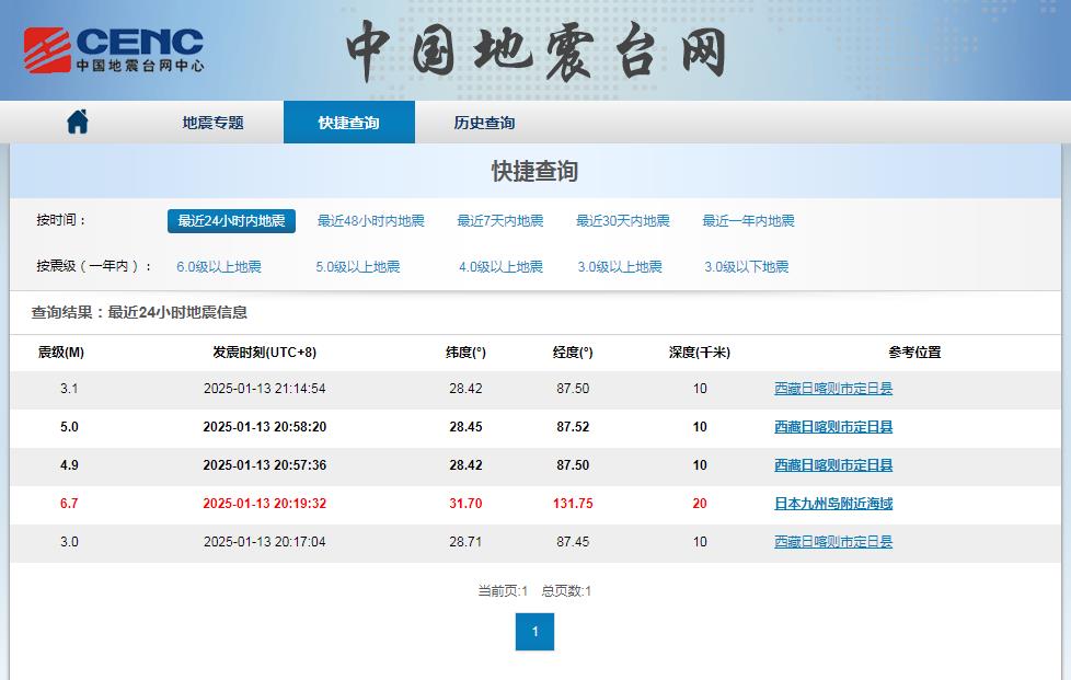 第1次發(fā)震時刻20:17:04、北緯28.71°、東經(jīng)87.45°、震源深度10千米、震級3.0級;
