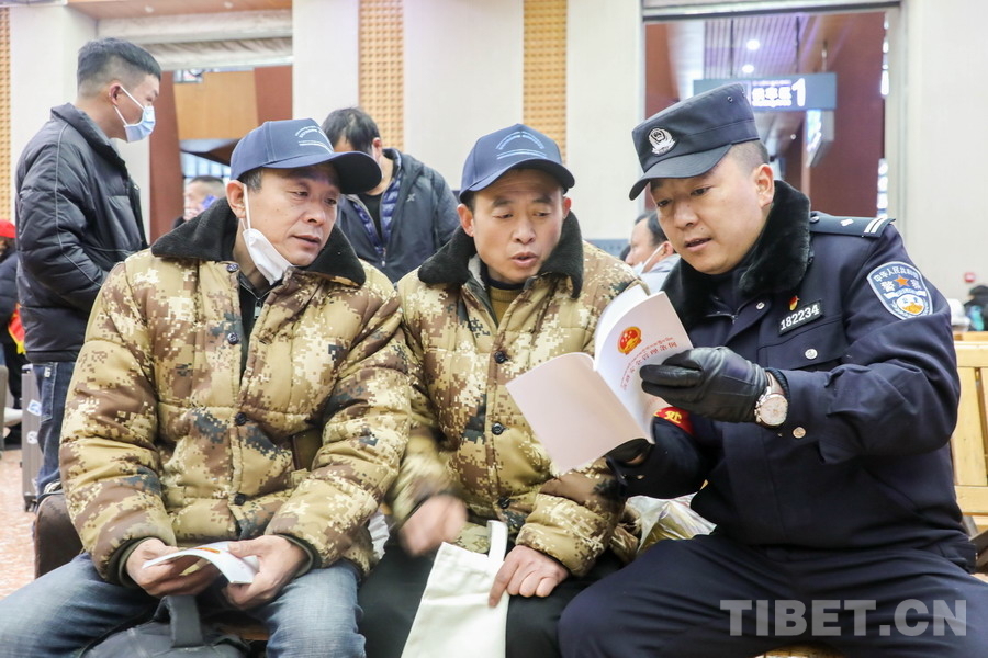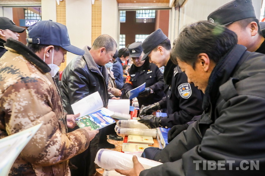 圖為春運(yùn)首日,西藏自治區(qū)司法廳聯(lián)合黨委政法委護(hù)路辦、拉薩鐵路公安處等單位在拉薩站區(qū)開展普法宣傳活動(dòng)攝影:黃飛