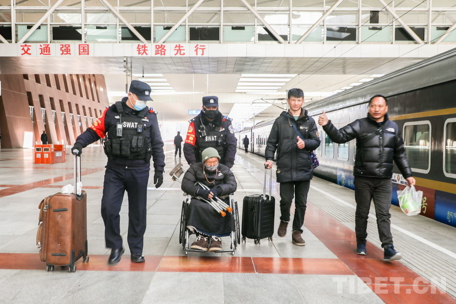 圖為拉薩站派出所民警羅松達(dá)哇(左二)與同事一起幫助殘疾旅客快速進(jìn)站,旅客豎起大拇指并不斷地說(shuō)“托切那(謝謝)”攝影:黃飛