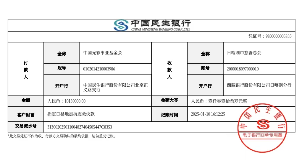 圖為中國光彩事業(yè)基金會(huì)捐款回單(其中一筆) 中國光彩事業(yè)基金會(huì)供圖