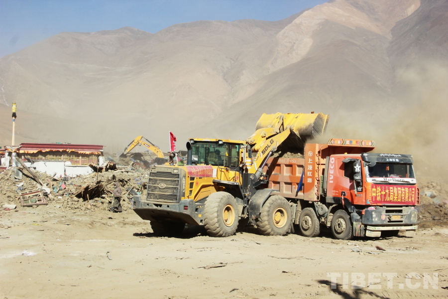 圖為地震重災(zāi)區(qū)西藏自治區(qū)日喀則市定日縣長所鄉(xiāng)森嘎村危房除險(xiǎn)現(xiàn)場,裝載機(jī)正在向渣土車傾倒建筑垃圾 攝影:劉莉