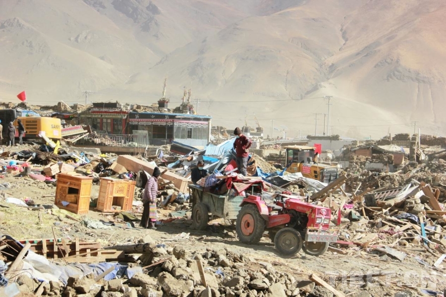 圖為地震重災(zāi)區(qū)西藏自治區(qū)日喀則市定日縣長所鄉(xiāng)除險(xiǎn)現(xiàn)場,村民在已完成除險(xiǎn)的地方搜集尚可再次利用的物資,旁邊未受到嚴(yán)重?fù)p壞的房屋被保留下來 攝影:劉莉