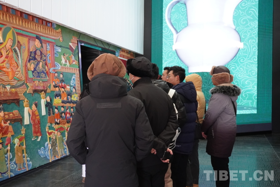 “合同一家”部分展示了布達(dá)拉宮館藏織物、唐卡、造像等精美文物。一件件來自江南的織物,一幅幅風(fēng)格融合的唐卡,巧妙地展現(xiàn)出一種獨(dú)特的和諧之美。這種融合不僅是一場視覺上的盛宴,更深層次地引發(fā)了參觀游客對于民族文化交流的共鳴。它們仿佛是茶馬古道上的使者,承載著西藏與祖國各地各民族往來交流的歷史,讓參觀游客在贊嘆其工藝精湛的同時(shí),也能深刻感受中華民族文化的厚重與魅力。