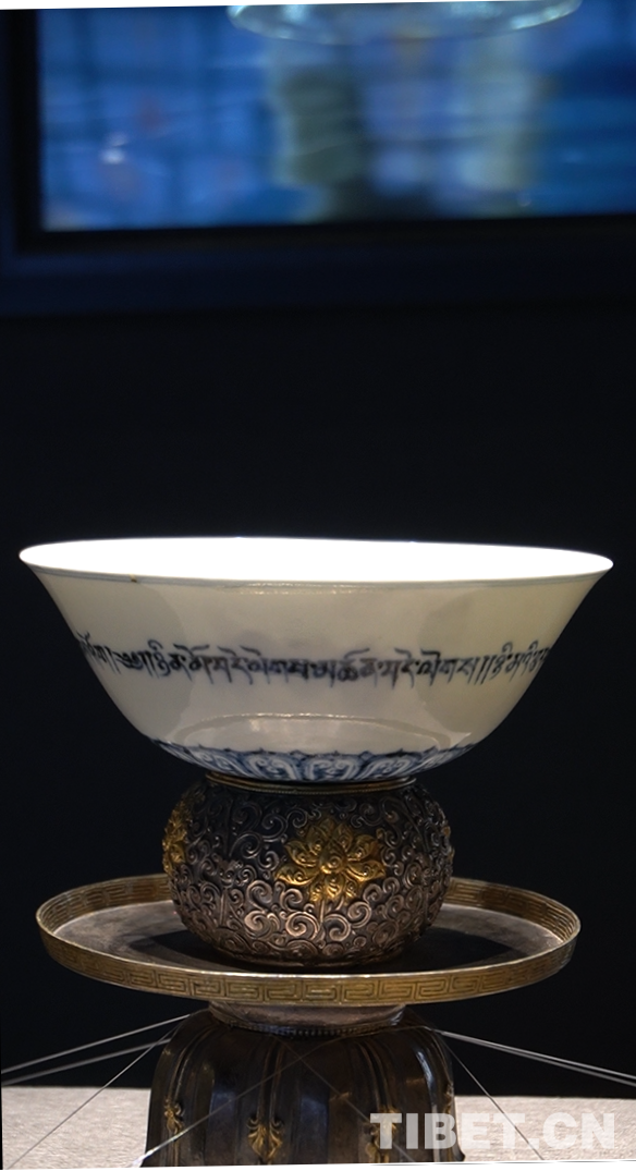 圖為“宣德年制”款青花藏文紋高足碗及銀鏨花紋碗座。高足碗是元代以來的重要瓷器樣式,這套高足碗外壁一圈書藏文吉語,大意為:日平安,夜平安,三寶永遠(yuǎn)賜平安。碗下側(cè)高足外圈飾蓮花紋,碗底書有“宣德年制”款,并配有一套錯金銀簪花的碗托。風(fēng)格的融合不僅讓這套高足碗擁有跨越地域的文化韻味,更引領(lǐng)著參觀游客探索與欣賞民族交往交流交融帶來的無限可能 攝影:張宇