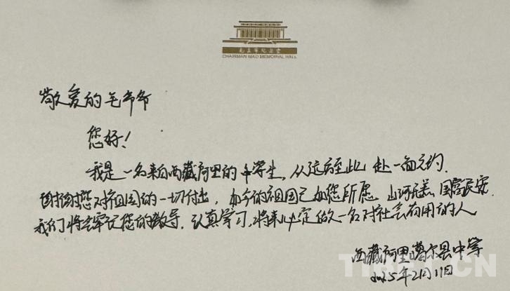 “敬愛(ài)的毛爺爺,您好!我是一名來(lái)自西藏阿里的中學(xué)生。從遠(yuǎn)方至此,赴一面之約。謝謝您對(duì)祖國(guó)的一切付出。如今的祖國(guó)如您所愿,山河無(wú)恙,國(guó)泰民安。我們將牢記您的教導(dǎo),認(rèn)真學(xué)習(xí),將來(lái)必定做一名對(duì)社會(huì)有用的人!”