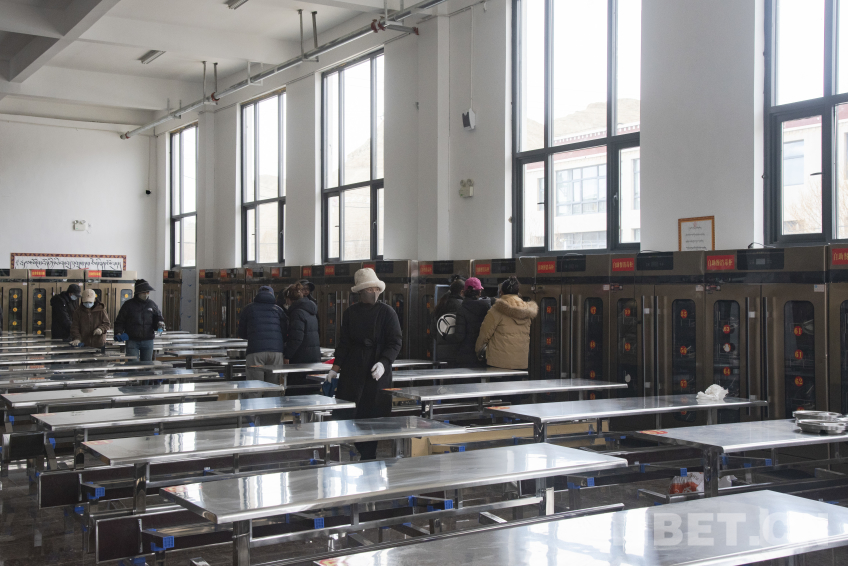 圖為長所鄉(xiāng)完全小學集中安置辦學點內新規(guī)劃的學生食堂,教職工們正在清理食堂衛(wèi)生?!z影:趙振宇