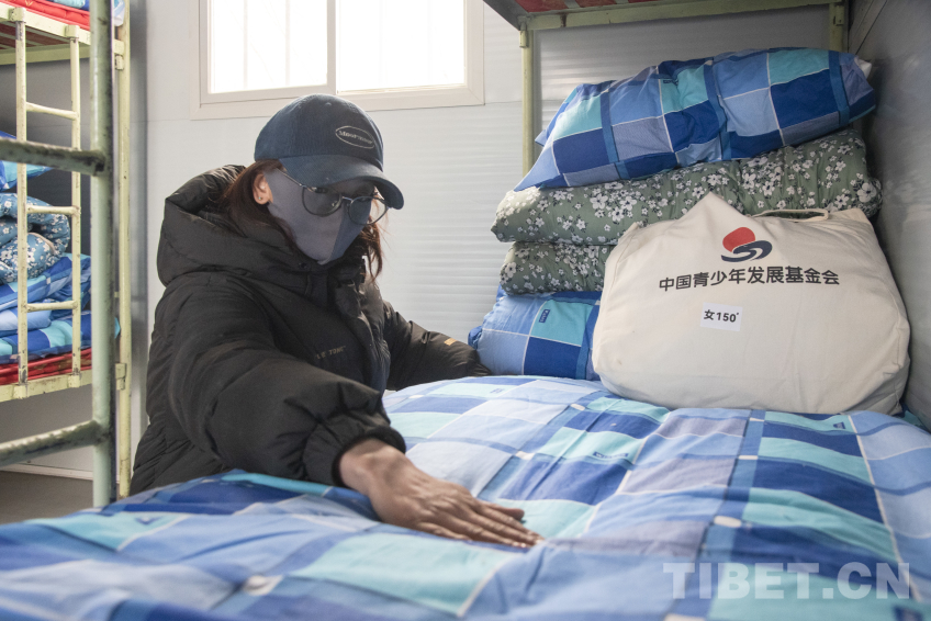 圖為長所鄉(xiāng)完全小學教師次旦卓嘎正在學生板房宿舍內為學生整理床鋪 攝影:趙振宇