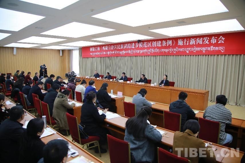 新修訂的《西藏自治區(qū)民族團(tuán)結(jié)進(jìn)步模范區(qū)創(chuàng)建條例》施行新聞發(fā)布會現(xiàn)場。攝影:趙釗