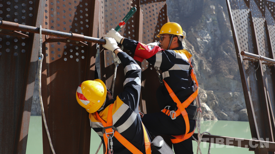 高空峽谷風(fēng)急聲勁,每一位加查路橋維修工區(qū)上拱的職工都要經(jīng)歷身體因恐高眩暈和不適,再到逐步適應(yīng)和習(xí)慣,最終喜歡爬到橋的最高處眺望雅魯藏布江蜿蜒而過(guò)的過(guò)程。