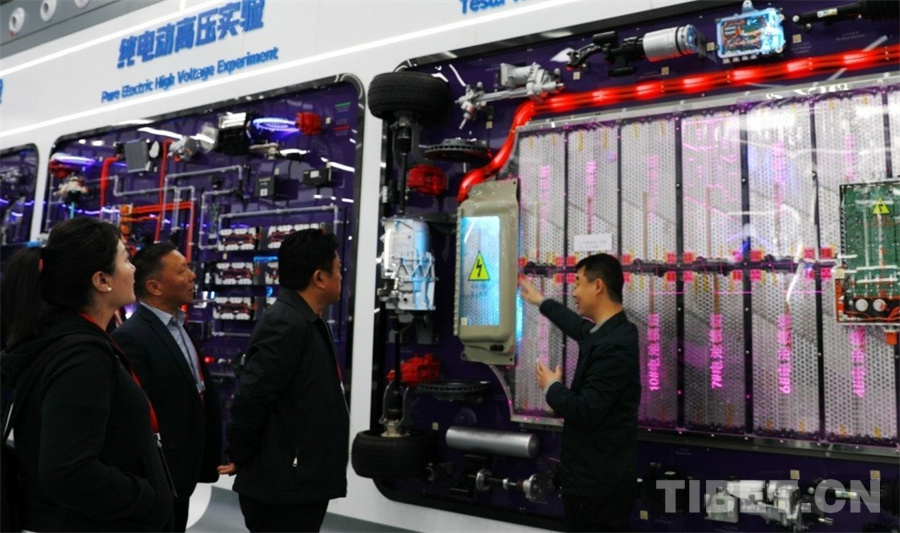 “這是由7104節(jié)電池組成的特斯拉的電池組,它是402伏的高壓電。所以,沒(méi)有經(jīng)過(guò)專業(yè)培訓(xùn)進(jìn)行電動(dòng)汽車維修會(huì)有一定的危險(xiǎn)性?!北狈絿?guó)際汽車教育展廳、車間負(fù)責(zé)人黨超為到訪的西藏自治區(qū)工商聯(lián)民營(yíng)企業(yè)家赴京學(xué)習(xí)參觀團(tuán)一行詳細(xì)介紹著墻上展示的電池組。大家聽(tīng)得津津有味。