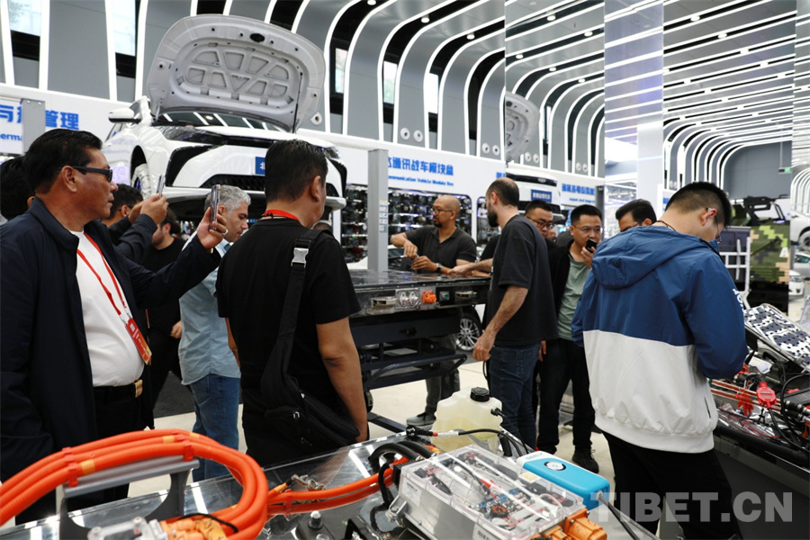 圖為觀摩來(lái)自伊朗、埃塞俄比亞等國(guó)家的學(xué)生實(shí)操新能源汽車電池組維修 攝影:劉莉