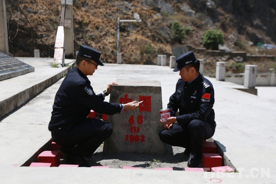 圖為吉隆出入境邊防檢查站執(zhí)勤四隊(duì)民警在中尼邊境對(duì)48號(hào)界樁描紅 攝影:肖富貴
