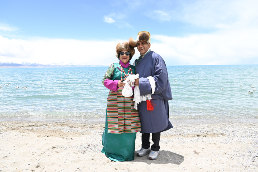 圖為尼泊爾駐拉薩總領(lǐng)事拉克西米·普拉薩德·尼羅拉夫婦在湖邊合影 攝影:旦曲