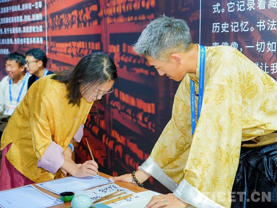 圖為參觀者正在現(xiàn)場體驗(yàn)藏文書法
