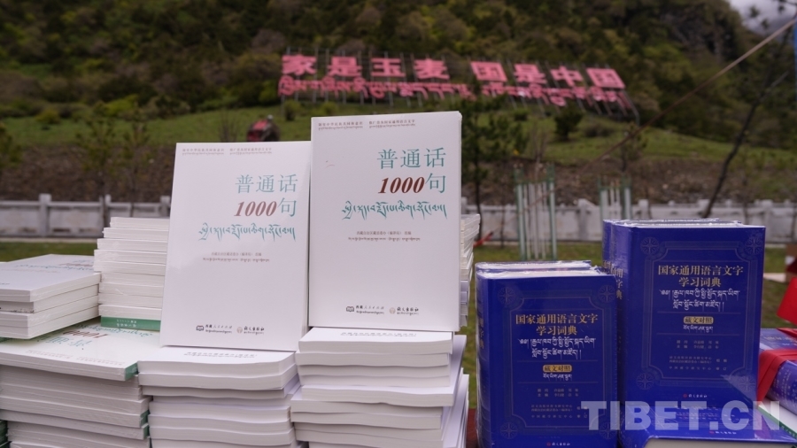圖為《普通話1000句》漢藏對(duì)照版、《國(guó)家通用語(yǔ)言文字學(xué)習(xí)詞典》(藏文對(duì)照)等書籍