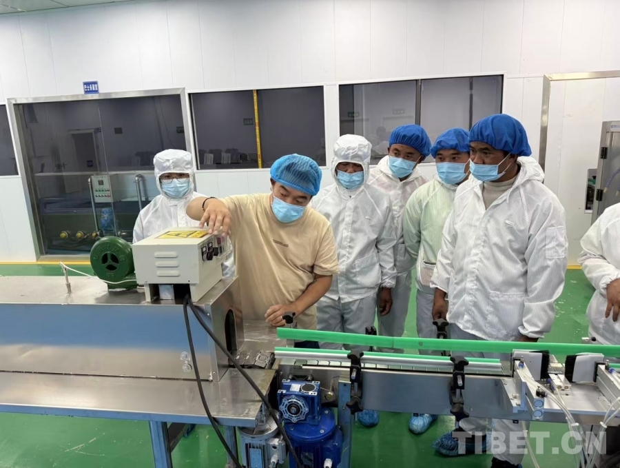 圖為生產(chǎn)車間里,巴桑旦增正專注調試設備,身旁同事們認真觀摩學習