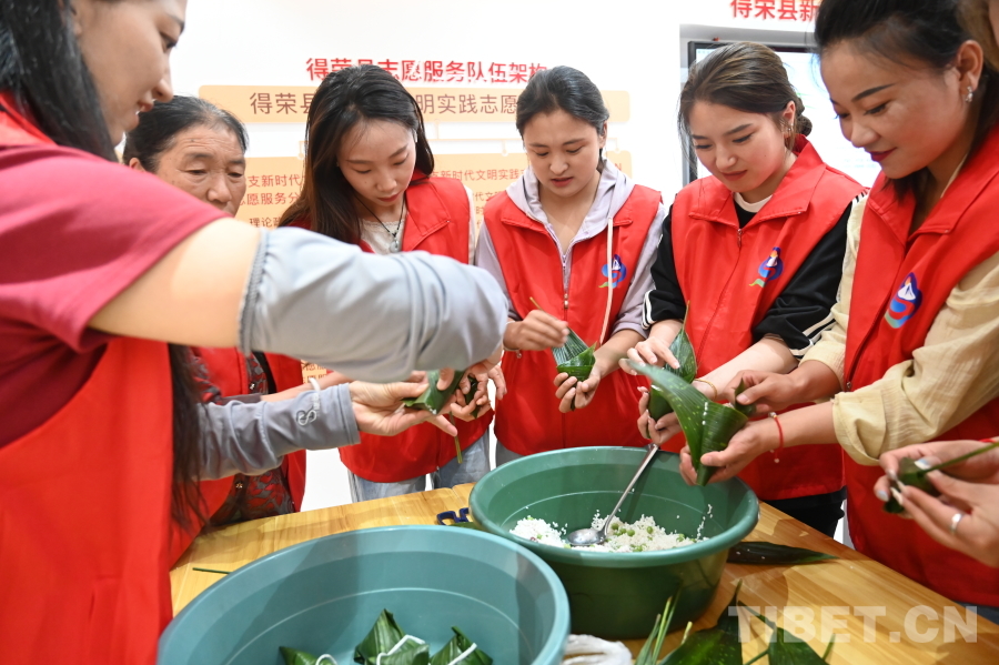圖為得榮縣志愿服務(wù)隊(duì)在包粽子
