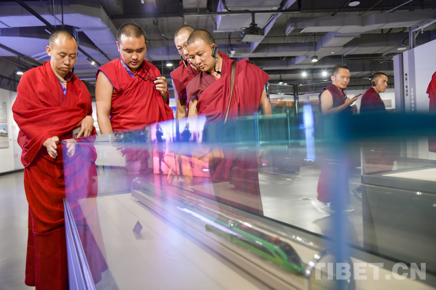 圖為西藏佛學(xué)院師生在高原“綠巨人”復(fù)興號動車組模型前駐足 攝影:趙振宇