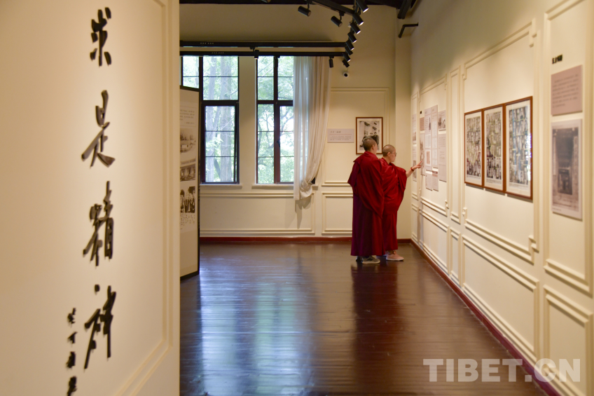 圖為西藏佛學(xué)院學(xué)員在浙大校史館內(nèi)談?wù)撝罢愦笙壬?攝影:趙振宇