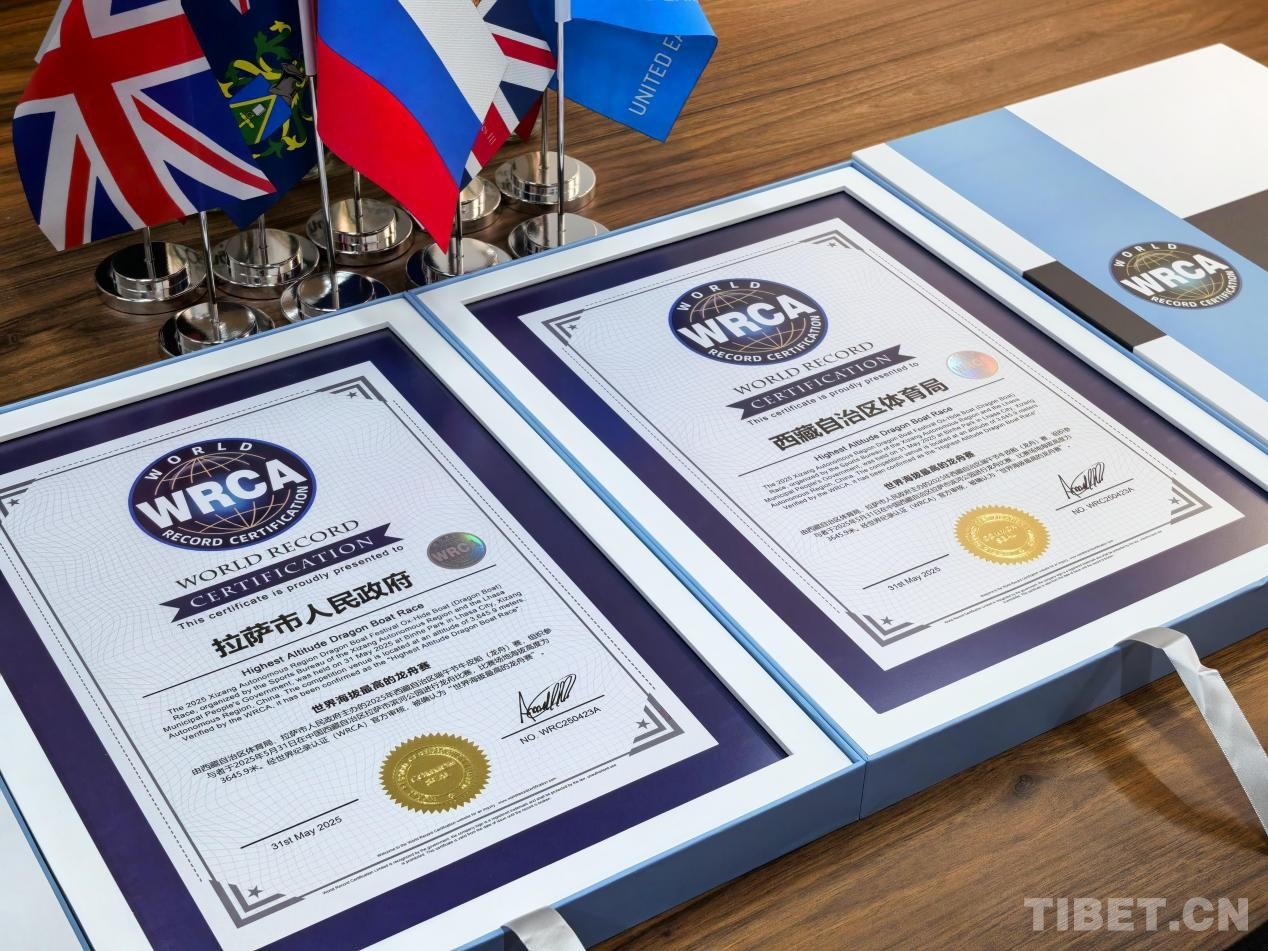 世界紀(jì)錄認(rèn)證機(jī)構(gòu)(WRCA)認(rèn)證官馬克先生發(fā)來賀電;WRCA中國區(qū)認(rèn)證官王靜女士現(xiàn)場(chǎng)宣布了世界紀(jì)錄認(rèn)證結(jié)果;WRCA中國區(qū)負(fù)責(zé)人、世界紀(jì)錄申報(bào)中心主任趙青太為西藏自治區(qū)體育局、拉薩市人民政府頒發(fā)了“世界海拔最高的龍舟賽”世界紀(jì)錄認(rèn)證書。