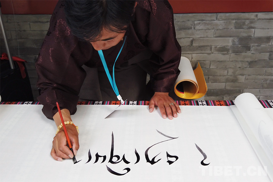圖為那曲市書法家協(xié)會(huì)的斯秋平措現(xiàn)場展示藏文書法 攝影:楊月云