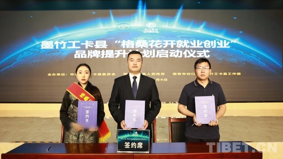 圖為貢覺卓瑪(左一)參加墨竹工卡縣舉辦的“格桑花開就業(yè)創(chuàng)業(yè)”品牌提升計(jì)劃啟動儀式并簽訂合作協(xié)議