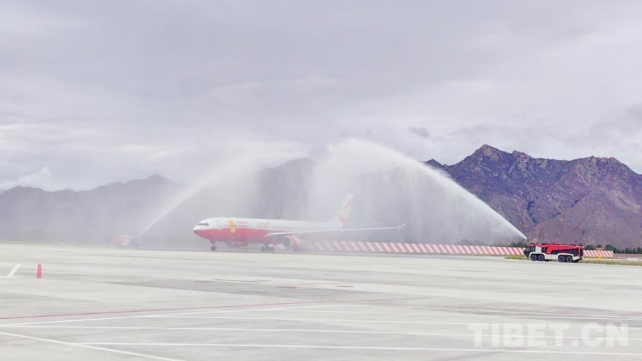 圖為8L9669航班在拉薩貢嘎國(guó)際機(jī)場(chǎng)穿過(guò)“水門”