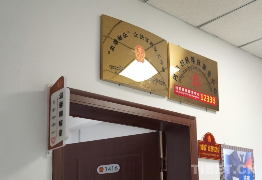 圖為阿里地區(qū)中級人民法院的溫馨調(diào)解室及“象雄梅朵”女法官維權(quán)工作站牌匾 攝影:邊子捷
