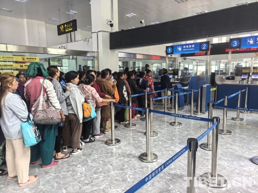 圖為聶拉木邊檢站民警引導出境旅客有序排隊待檢(7月15日攝) 攝影:高榮元