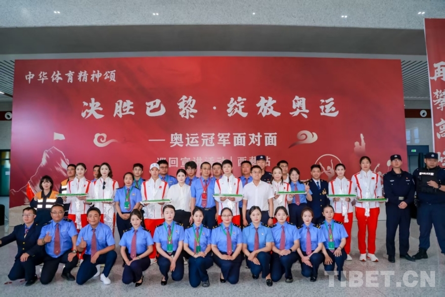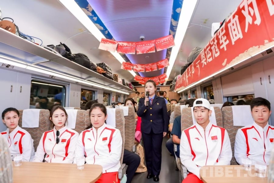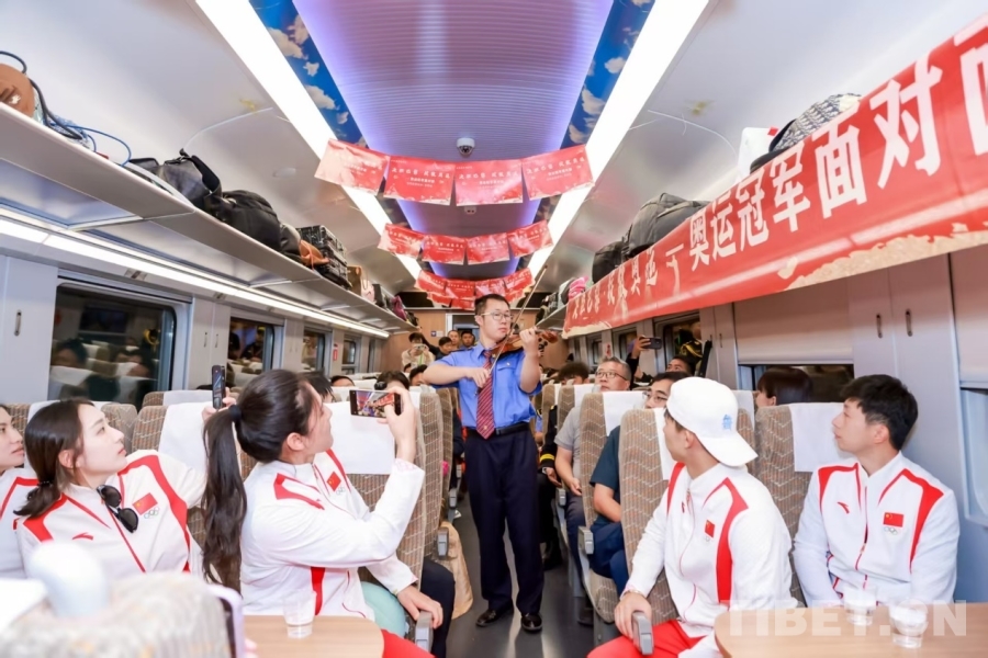 圖為奧運(yùn)冠軍走進(jìn)林芝火車站