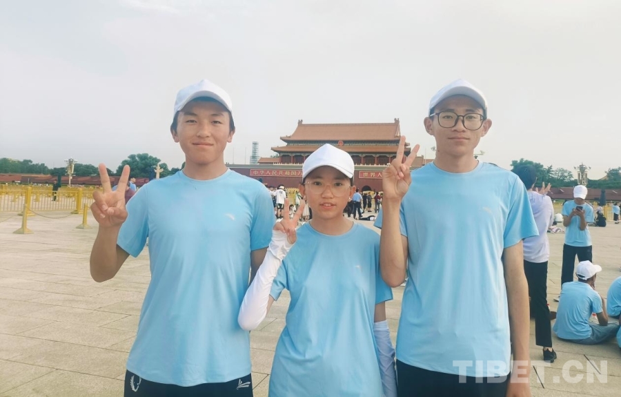 圖為參加“山河同脈·京華筑夢”研學活動的西藏日喀則定日縣中學生達娃次仁(左)、旦增桑旦(中)和古入曲桑(右)在天安門廣場上 攝影:趙釗