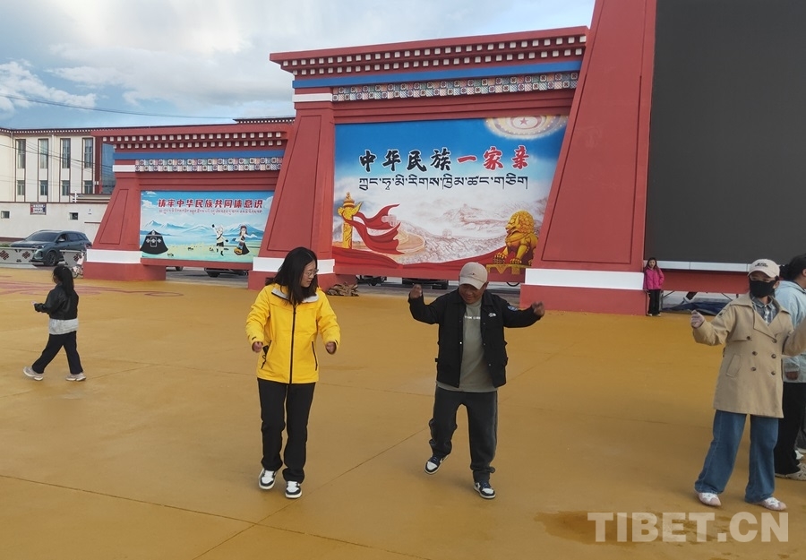 圖為在尼瑪縣民族團結(jié)進步主題廣場,筆者向扎西索朗學跳鍋莊舞 攝影:昂翁洛布