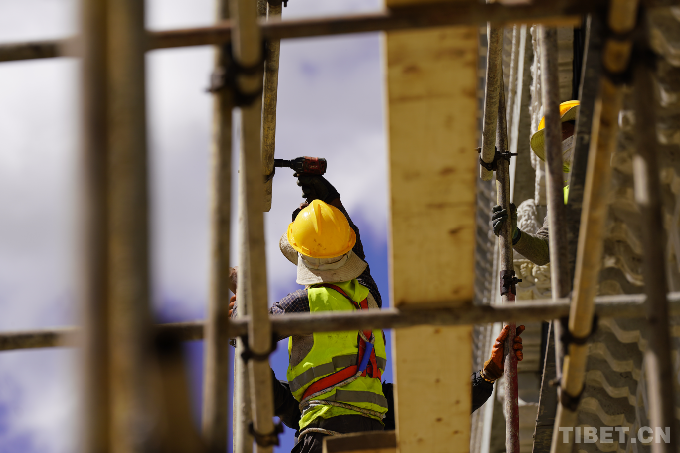 圖為維修加固班組工作人員正在搭架放線