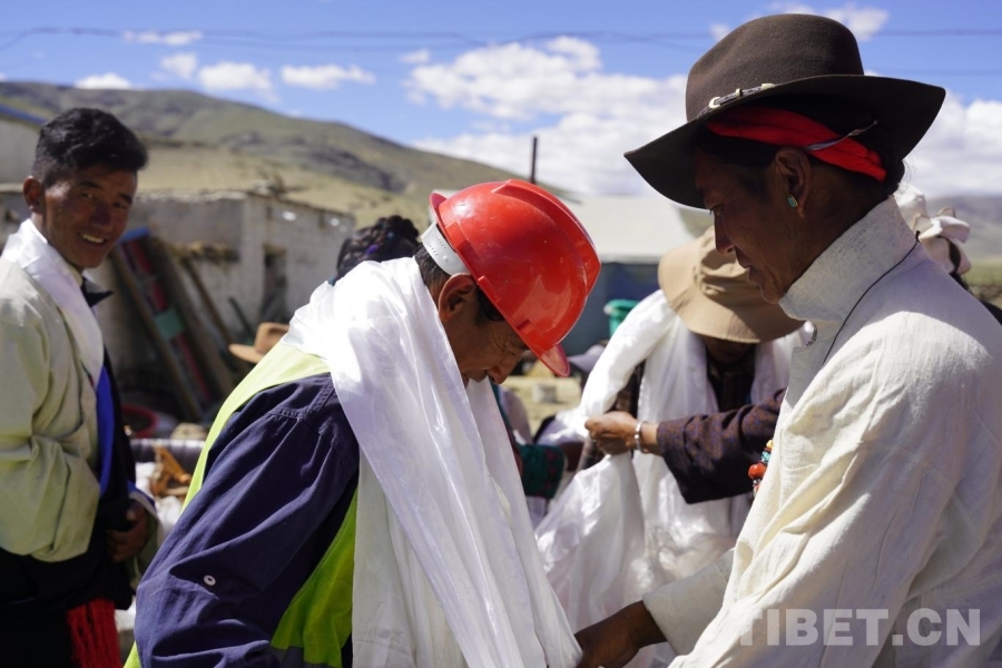 圖為封頂儀式上村民為施工隊(duì)工作人員獻(xiàn)哈達(dá)