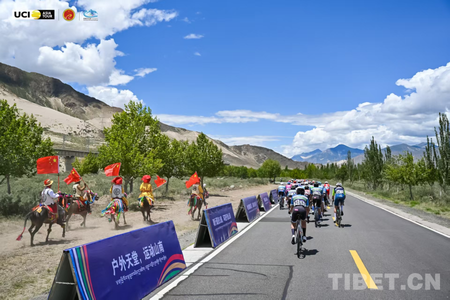 比賽途中,道路兩側(cè)的當(dāng)?shù)厝罕娚碇侥咸厣⒀b,有的手捧潔白的哈達(dá),有的高舉五星紅旗,還有的展示著山南的彩色氆氌,更有群眾騎著馬在道路兩旁為比賽騎手們加油助威。