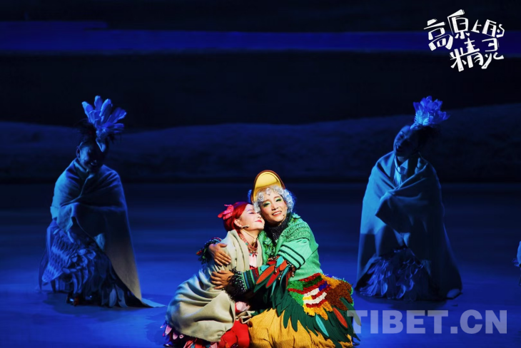 故事對“生態(tài)保護”的詮釋深刻且包容。它未將環(huán)境惡化歸咎于某一族群,而是通過母湖嚴寒、子湖干旱的對比,展現(xiàn)“生態(tài)系統(tǒng)無邊界”的現(xiàn)實:黑頸鶴需潔凈湖水,藏野驢需豐茂草原,均依賴子母湖的自然循環(huán)。當牦牛族用身軀為風雪中的鳥類擋寒,藏羚羊與黑頸鶴在重建的湖岸并肩眺望,舞臺上呈現(xiàn)的不僅是劇情的和解,更是對“團結(jié)協(xié)作守護家園”理念的生動演繹。劇中傳遞的協(xié)作精神,跳出了“人類中心”或“生態(tài)中心”的二元對立,體現(xiàn)了西藏傳統(tǒng)生態(tài)觀的系統(tǒng)性思維——保護珍稀物種是所有生命休戚與共的必然選擇,人與自然應是和諧共生的有機整體。