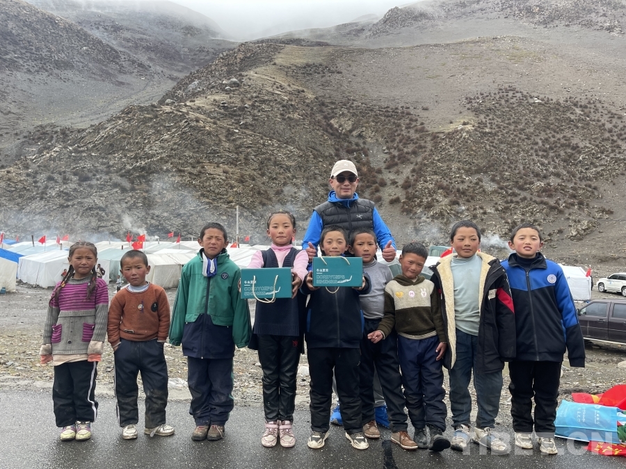 圖為馬志剛在比如縣扎拉溝向當(dāng)?shù)啬撩窈⒆荧I(xiàn)愛心 受訪者供圖
