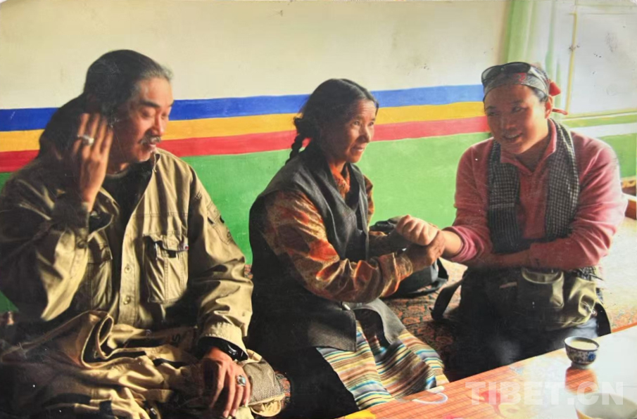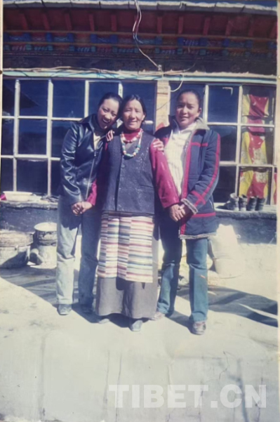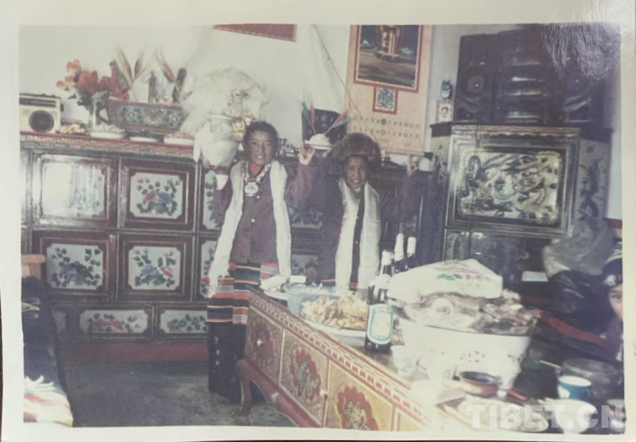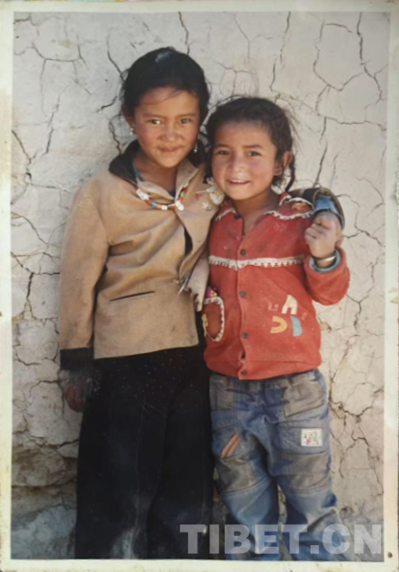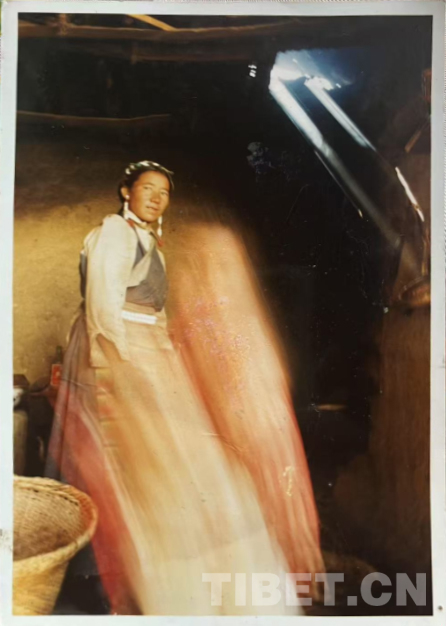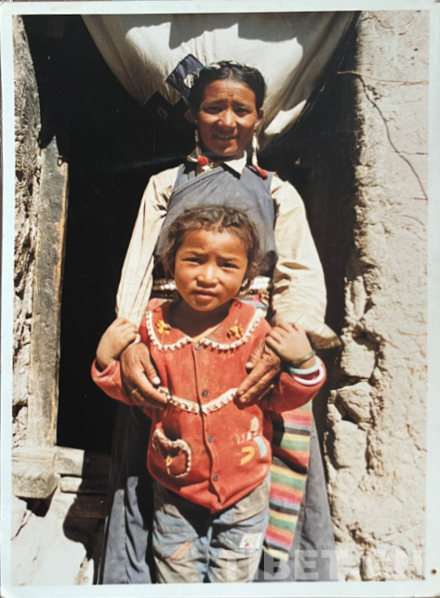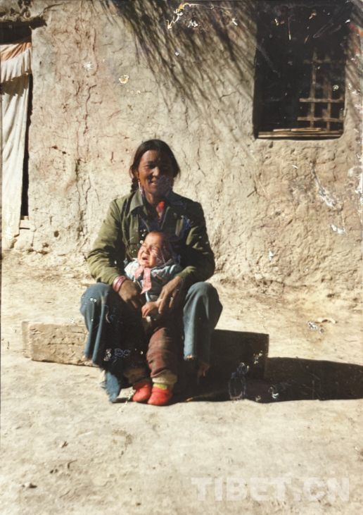 這是在我們家老房子門口照的。那時候全是土坯房,這間是四間房里最大的。大概是1990年左右。記得穿的這身衣服那些年很多人都穿,應該是軍裝,穿著這衣服騎馬去挖藥很多次。人民公社時期我們有八個生產隊,那時候要采藥掙工分,偶爾拉薩藏醫(yī)院的老師們會專程來札達,我們也要幫忙去采藥。這邊藥材很多,如雪蓮花、黃連、蒂丁等。拍這張照片時孩子的鞋和幾件衣服是我自己織的,但要買好衣服還得去阿里地區(qū)。那時我丈夫已經在開車,我們家條件稍好些,但也不是村里最好的。
