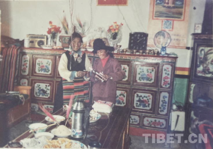照片中是我和二女兒。這是拆了前一張照片里的老房后新蓋的房子,比以前大,質量也好。這是過年時,女兒正給我倒果啤。哈哈哈!過年時每家每戶會準備兩個“切瑪”,大的要供在高處,另一個則是來客人時敬客用。那收音機也是個老收音機,我喜歡聽新聞,用這個聽過很多中央新聞。這時我們村通了電,也通了水,每家門口都有自來水,札達縣有發(fā)電站。2015年政府還給衛(wèi)生院蓋了新樓。