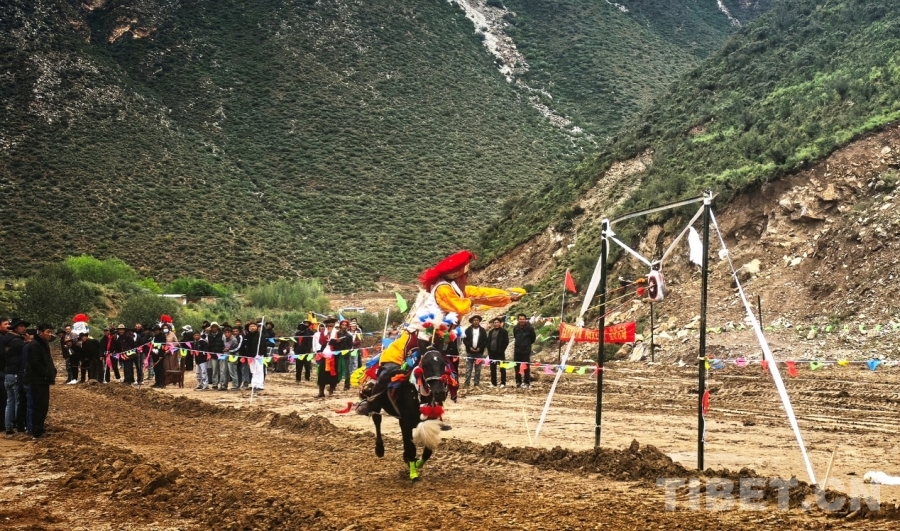 圖為西藏自治區(qū)山南市貢嘎縣昌果鄉(xiāng)普夏村望果節(jié)賽馬會(huì)現(xiàn)場,騎手正在參加騎馬射箭比賽 攝影:劉莉